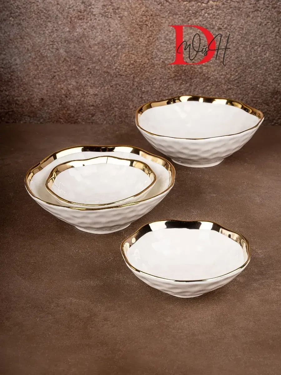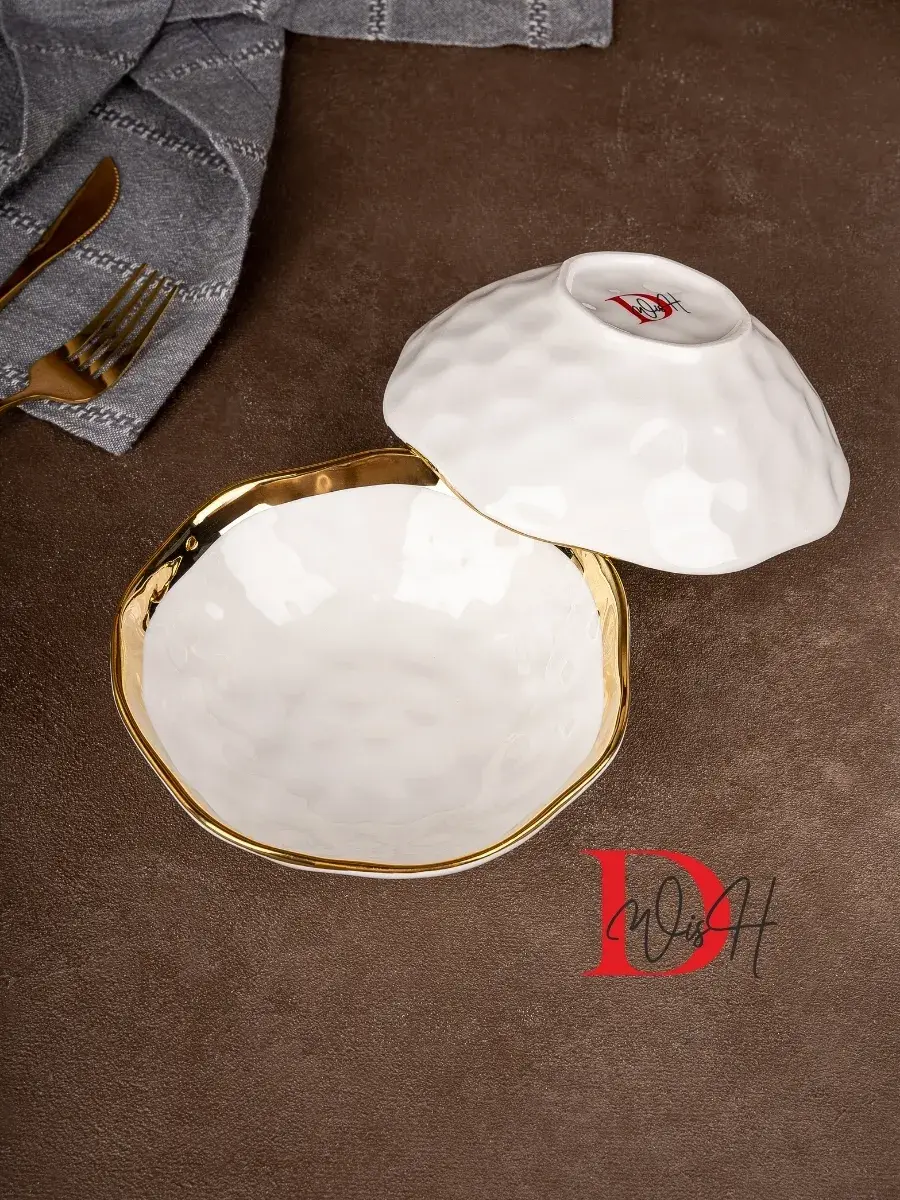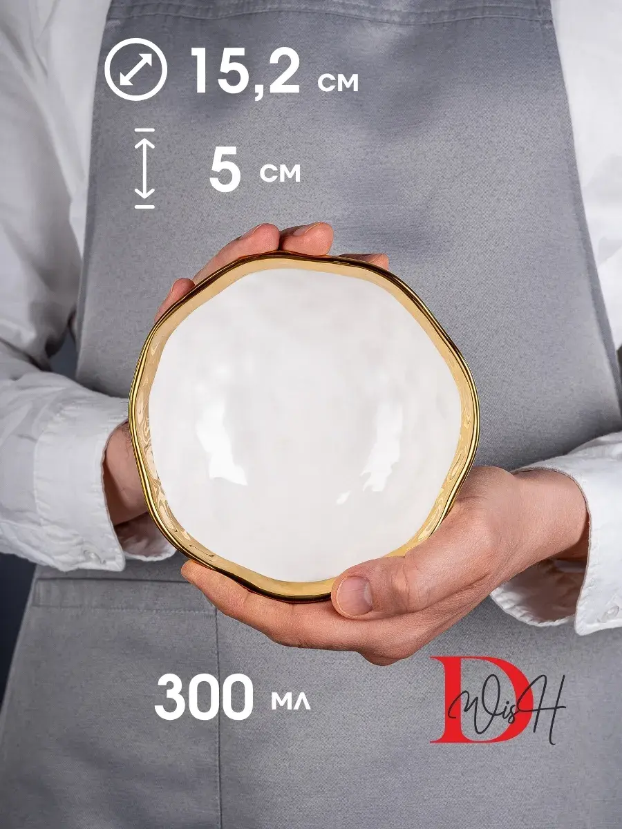 Наша посуда с золотом не только придаёт эстетики любимым блюдам, словно Вы в ресторане, кафе или кейтеринге, но и помогает при похудении. Она легкая и удобная в использовании, идеально подходит для каши на завтрак или салата, закусок с рыбой, сыром и орехами. Благодаря ручной работе и внимательности, внесенной в каждую деталь, Вы почувствуете заботу, которая вложена в каждую тарелку.