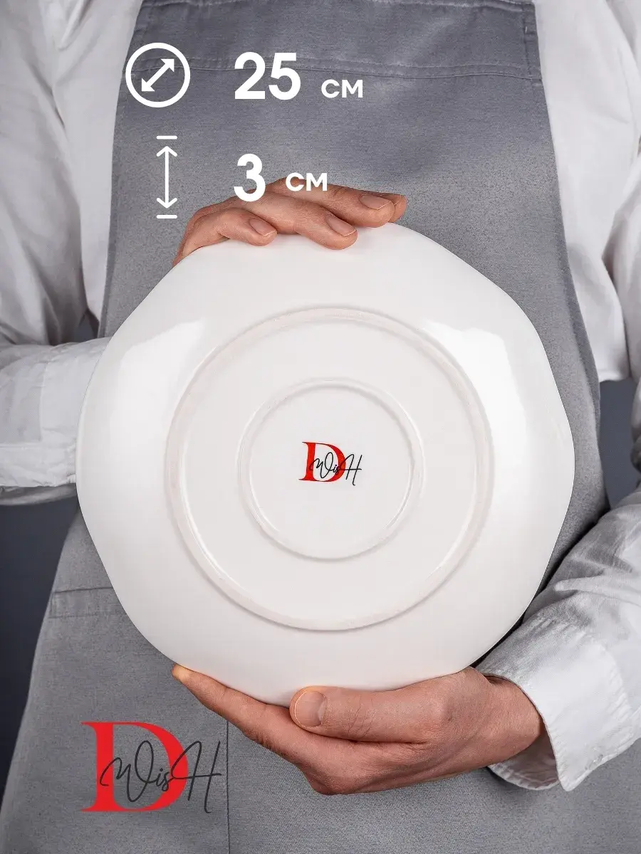 Тарелки бренда DWisH являются универсальными и многофункциональными. Они отлично подходят для сервировки праздничных столов или для повседневного использования. Вы сможете разместить на них широкий ассортимент блюд, начиная от китайской кухни до домашних десертов и сладостей в виде торта или пирожных. Особая форма с неровным краем, мятый фарфор придадут изысканности самым вкусным сухофруктам, сырному сету, роллам, суши или фруктам.