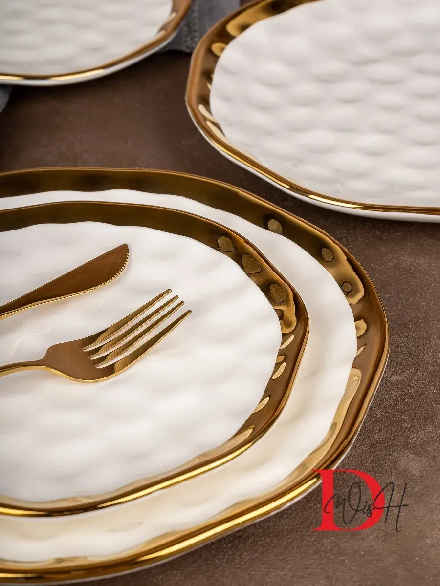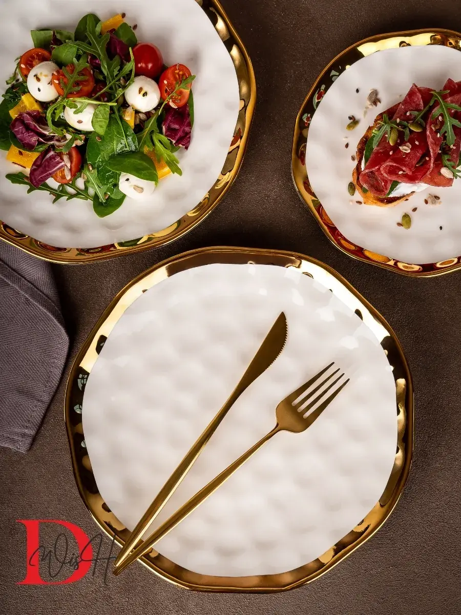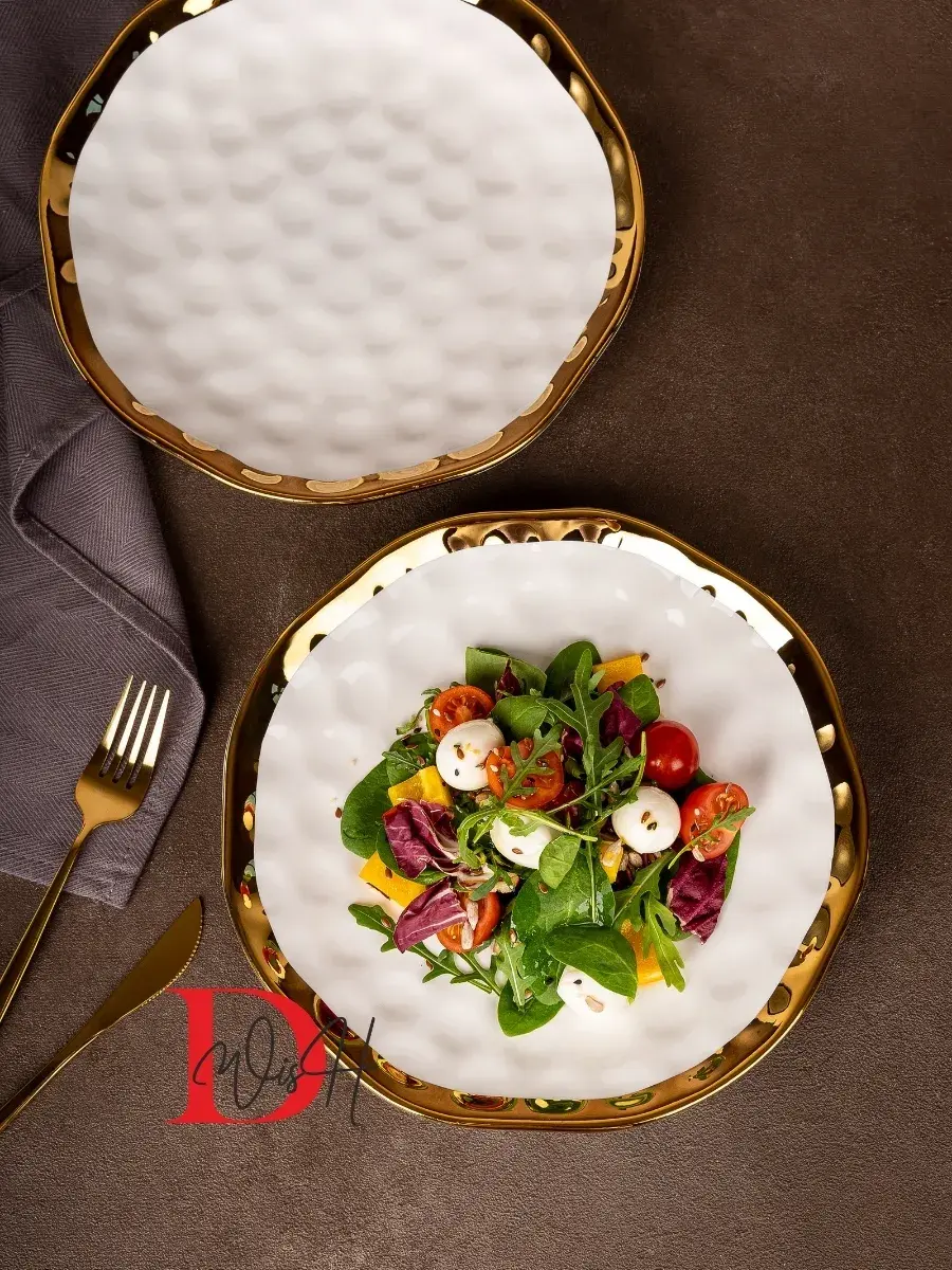 Наша посуда с золотом не только придаёт эстетики любимым блюдам, словно Вы в ресторане, кафе или кейтеринге, но и помогает при похудении. Она легкая и удобная в использовании, идеально подходит для каши на завтрак или салата, закусок с рыбой, сыром и орехами. Благодаря ручной работе и внимательности, внесенной в каждую деталь, Вы почувствуете заботу, которая вложена в каждую тарелку.