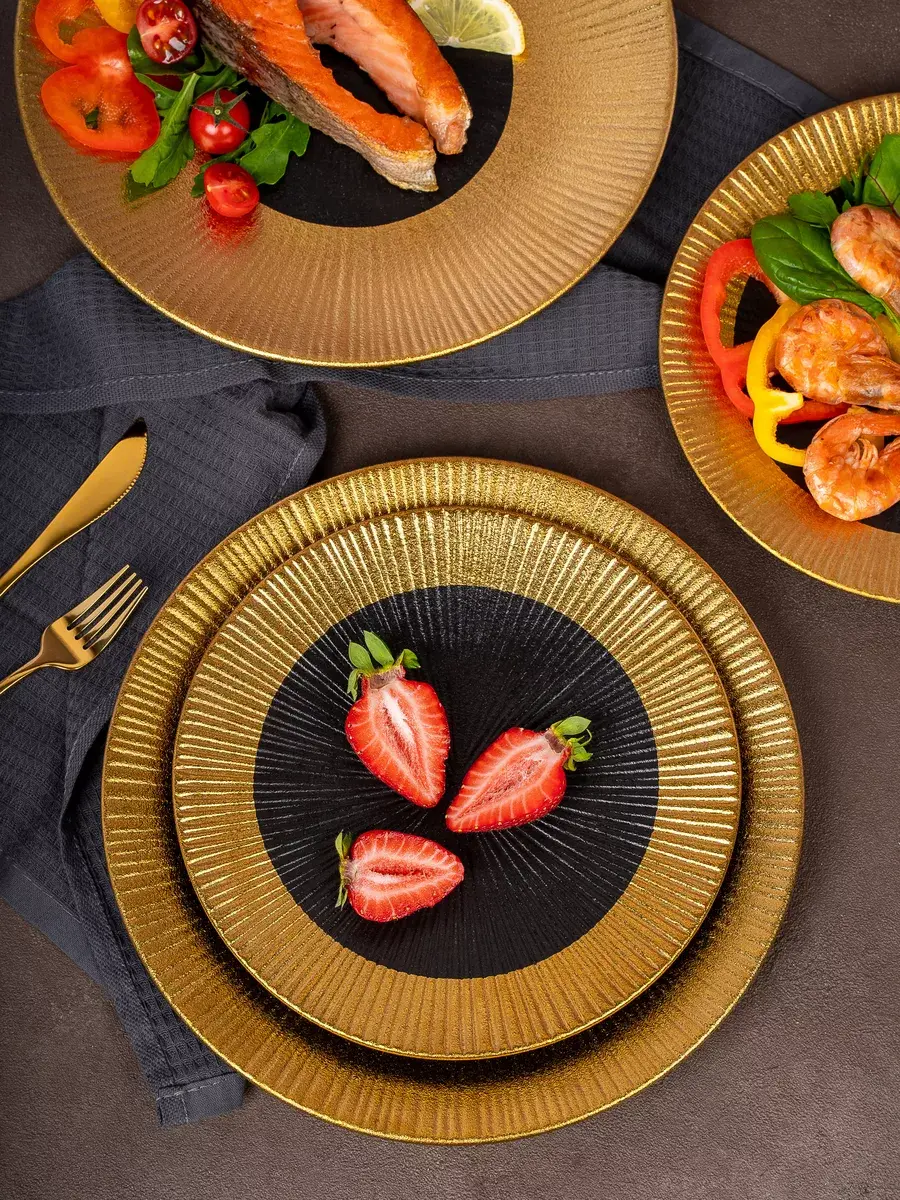 Тарелки с золотом созданы с использованием самых современных технологий и из натуральных материалов, что делает их безопасными и экологичными. Наша посуда идеально подходит для детей, а также для правильного питания (пп) взрослых.